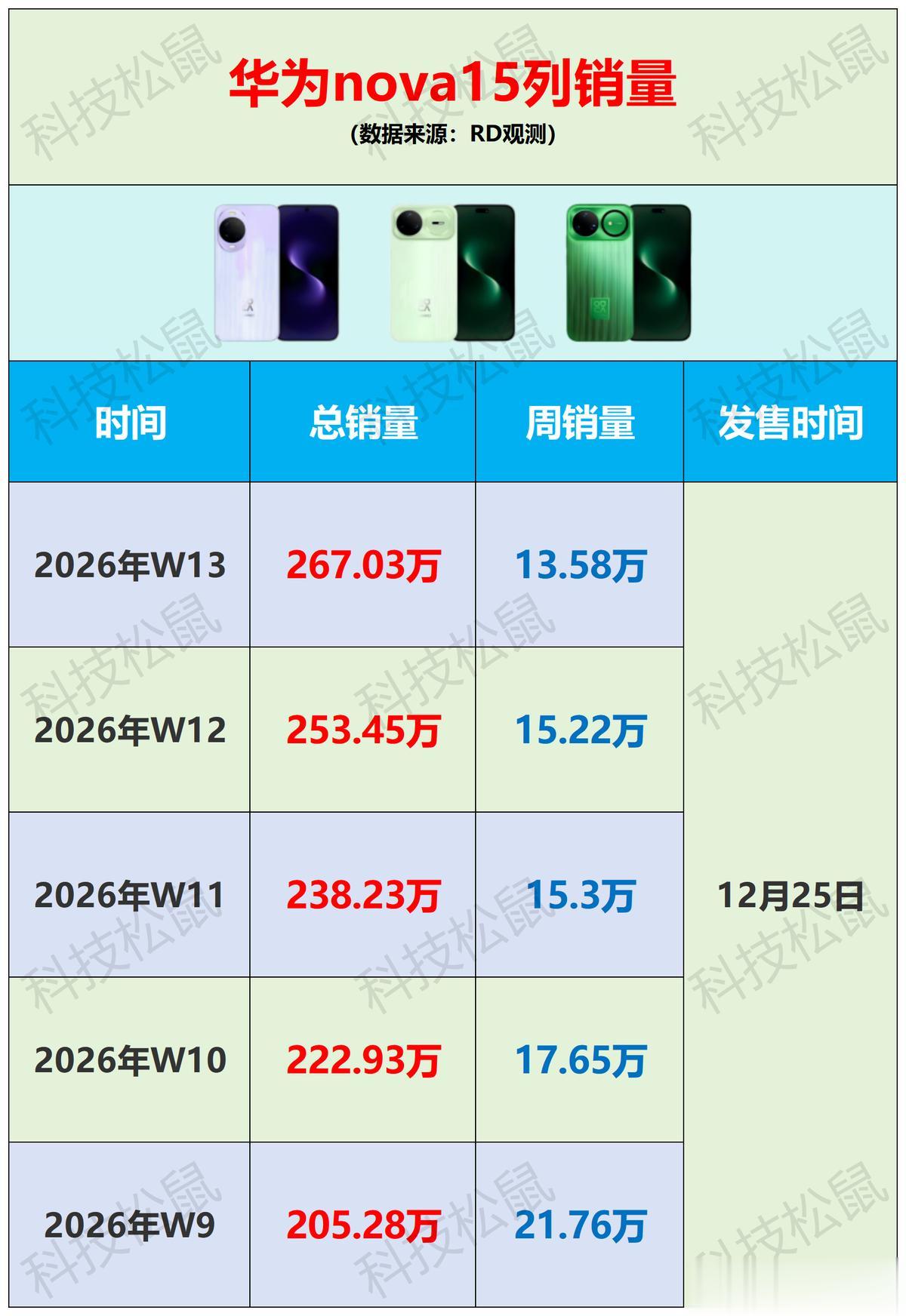截至2026年W13,华为nova15系列累计销量突破267.03万。华为nova15系列2025年12月25日上市,在5大国产中端手机中上市最晚,但销量早就超过了红米K90系列、vivo S50系列和荣耀500系列,仅次于OPPO Reno15系列。