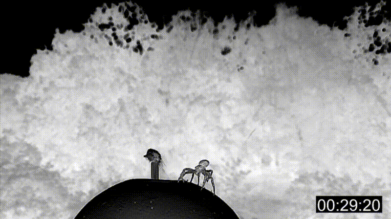 如果风力正合适的话——对这些蟹蛛来说,就是不高于3.3m/s且朝上吹——它们会扳直身体,撅起屁股对着天,喷出50到60根纳米级的丝线将自己托上天。