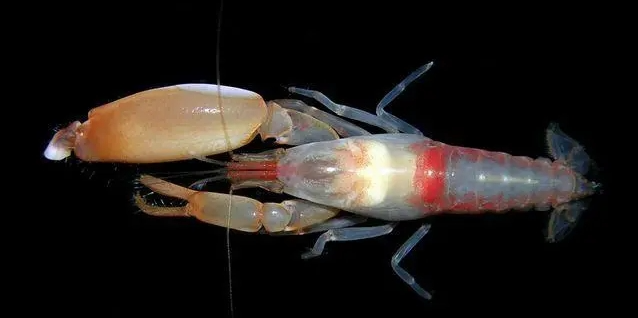 手枪虾的两个签字一大一小。大的签字一侧有凹槽,另一侧有凸起,需要发射的时候,钳子打开,凸起卡进凹槽里。这样,就把凹槽里的水打出去了。