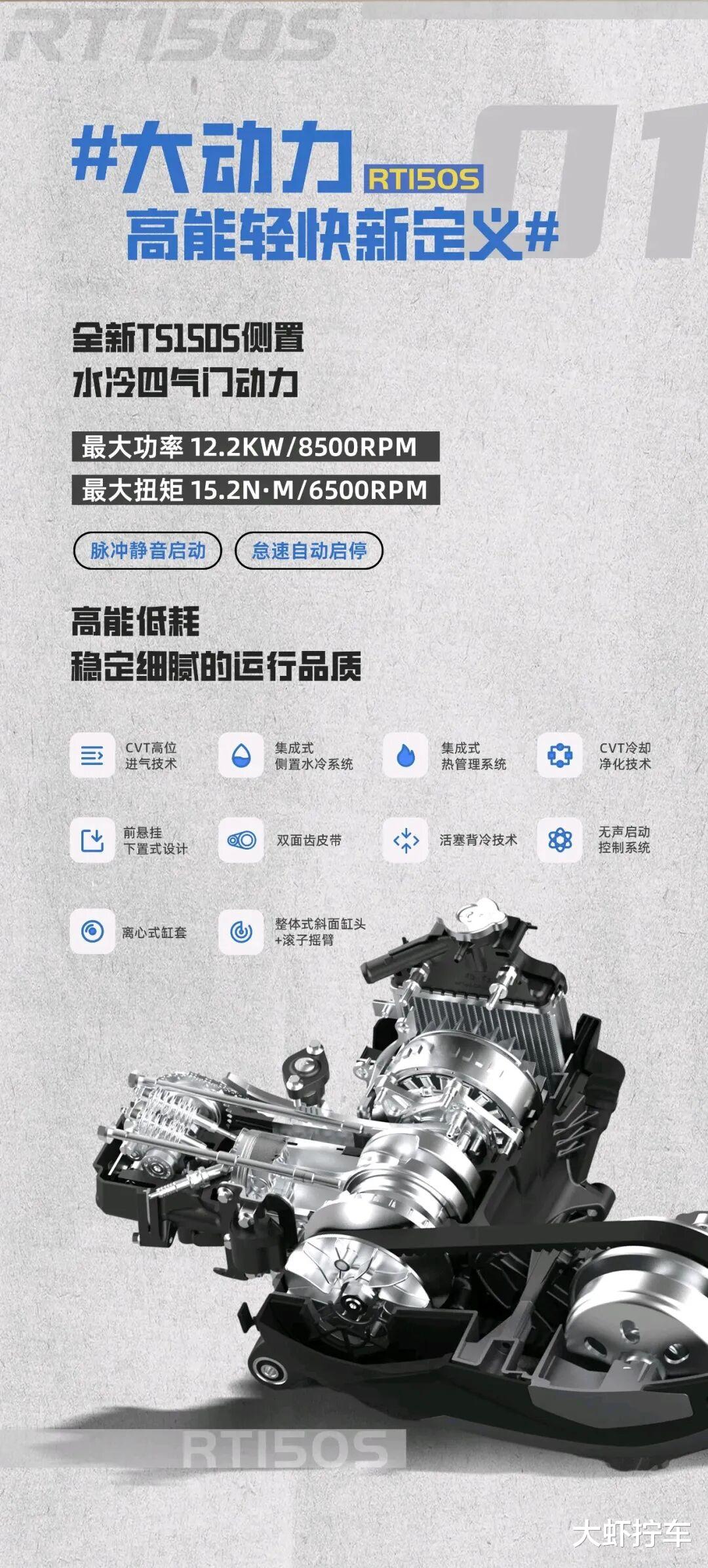 除了外观设计上的区别,RT150S的主要进化发生在动力总成上。RT150S上的发动机不再是RT150/RT150E米兰上的ZS1P57MJ-2发动机,全新的TS150S发动机最大功率和扭矩从11.5kw/14.5N.m提升至12.2kw/15.2N.m,一举来到国产150踏板水冷引擎的性能最前列,功率上超过了本田和春风车款的11.8kw看齐钱江,扭矩输出上则是目前已上市同类车型中名副其实的第一。