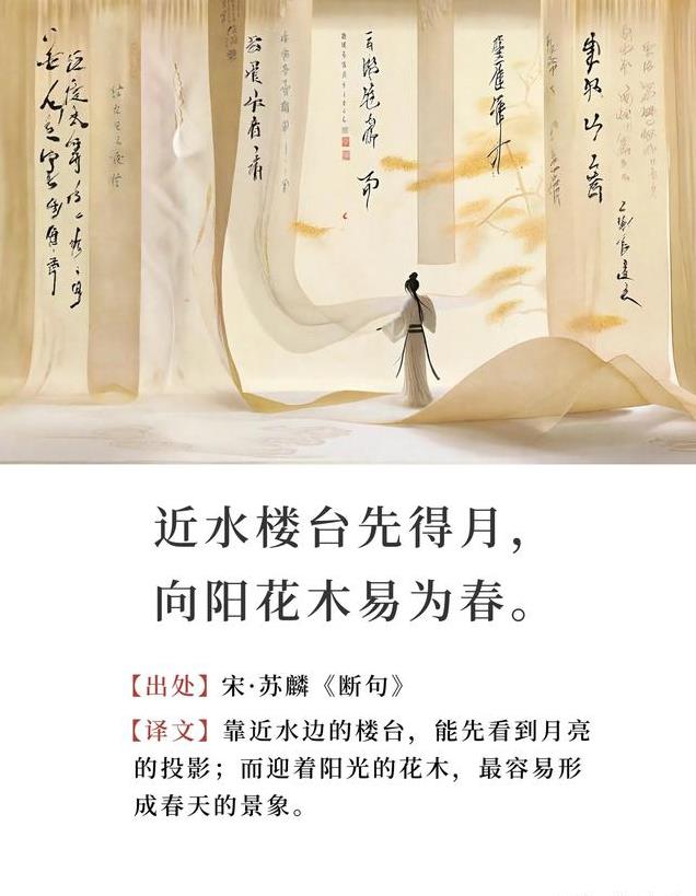 不过除了这五位唐朝的大神,宋朝还有一个诗人,就凭半首诗就名垂千史了。他叫苏林,他的诗里最出名的就是这半首,十四个字,被后世称为“断句”。就是这两句流传至今的诗句,不管你是白发苍苍的老头,还是顽皮捣蛋的小盆友,都能随口就来:“近水楼台先得月,向阳花木易为春。”