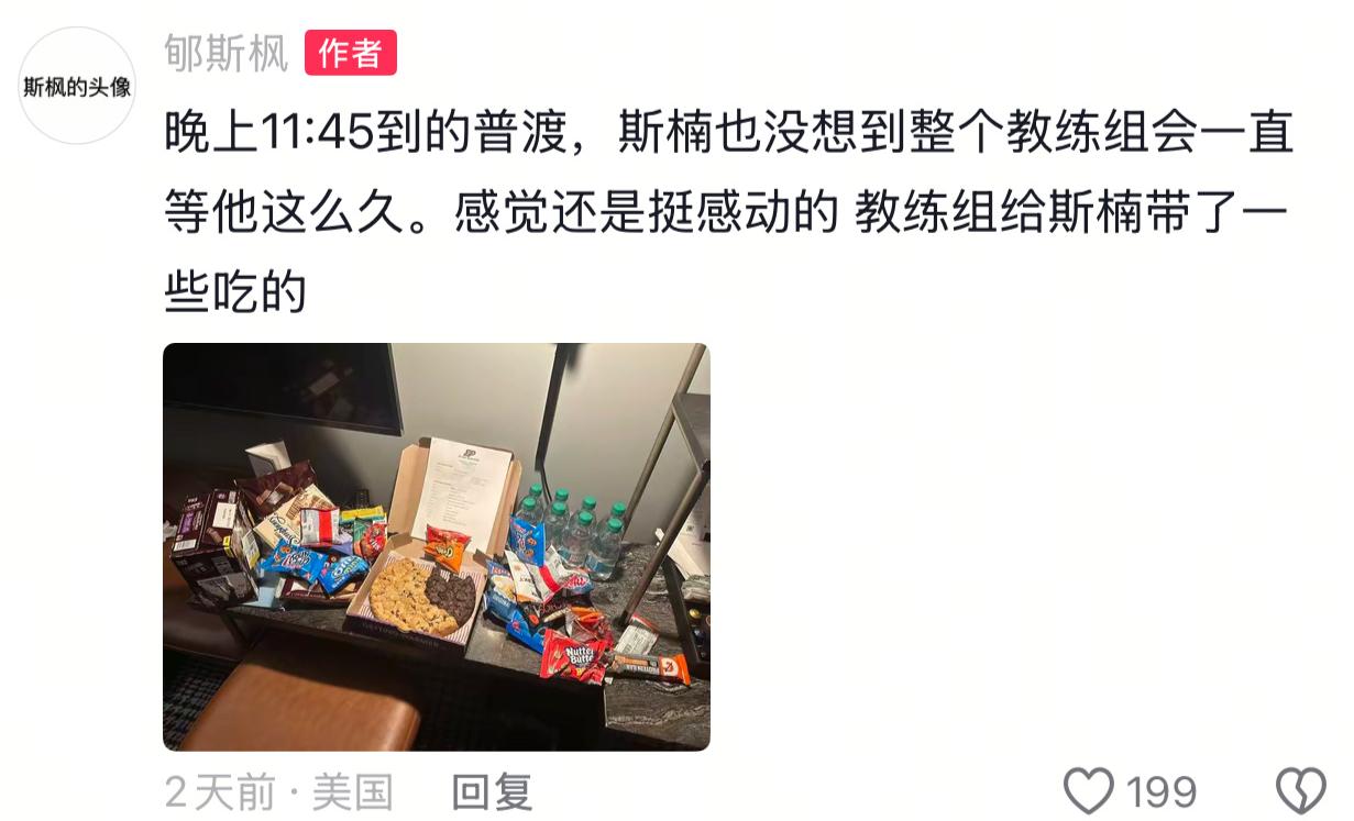 有意思的是根据郇斯枫透露,因为航班问题,郇斯楠几乎半夜12点才到普渡大学,而那时学校的整个教练组都在等他,甚至还准备了吃的东西,这对于向来喜欢准点上下班的美国人来说,是非常难得的事,这也更加说明了普渡大学对郇斯楠的看重!
