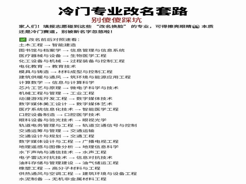专业“狸猫换太子”这波操作,堪称中国高等教育史上最大规模的“专业整容运动”。2024到2025年,随着高考报名人数波动、就业市场冷热不均,民办高校掀起了一场轰轰烈烈的“改名潮”。逻辑简单粗暴:既然考生不爱听“土木工程”,那就改叫“智能建造”;听见“市场营销”想吐,那就包装成“大数据营销”;“环境工程”没人报?“碳中和科学与工程”总该心动了吧?