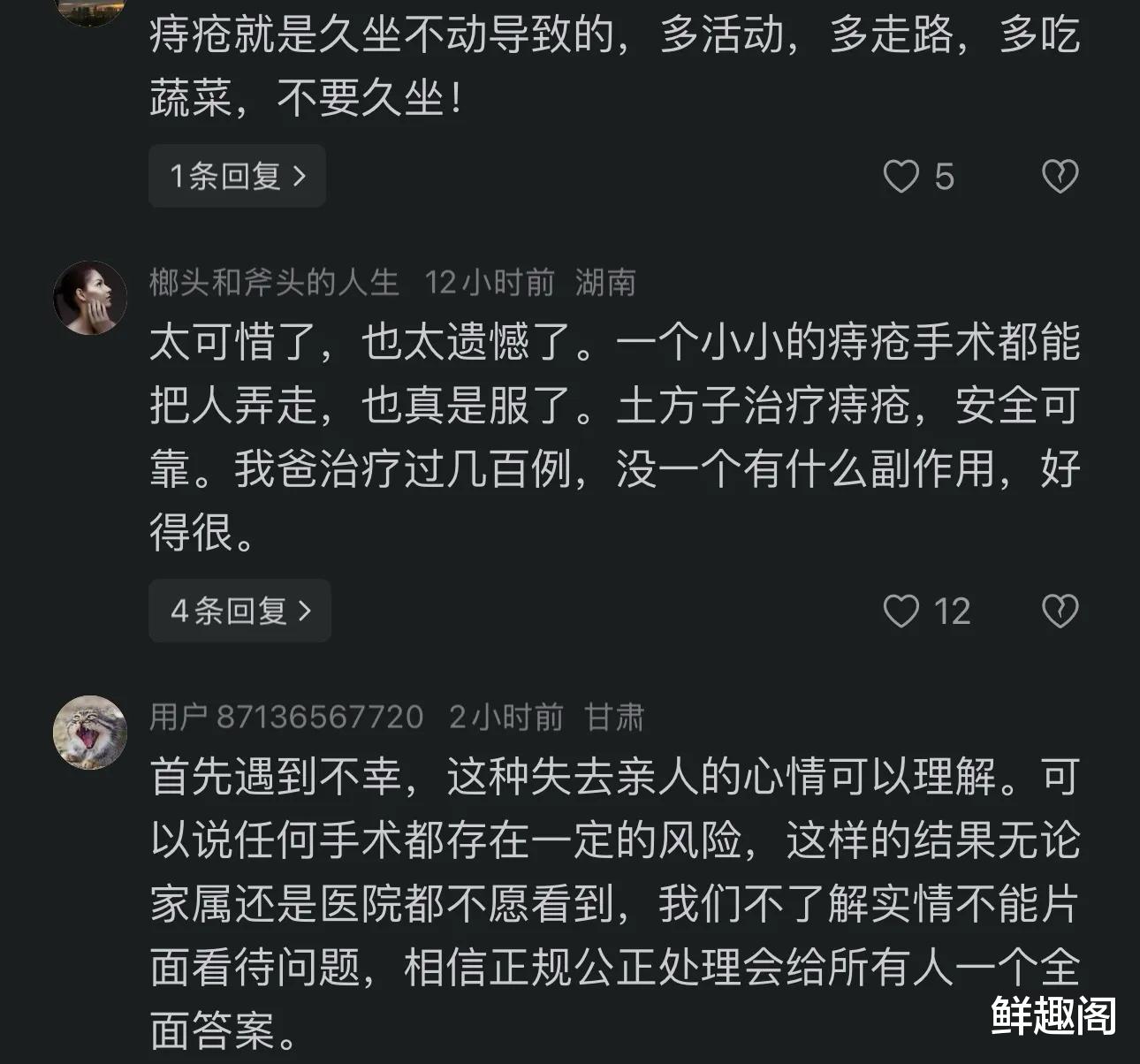 为明确母亲的死因,石先生已经同意进行尸检,报告大约会在一个月后出具。石先生希望医院能够积极地处理此事,并且给家属一个合理的解释。这件事情也在网上引发了广泛的讨论。一位网友说:“痔疮手术虽然是小手术,但任何手术都存在风险,术后护理和并发症预防同样重要,不应该因手术常见而掉以轻心。”