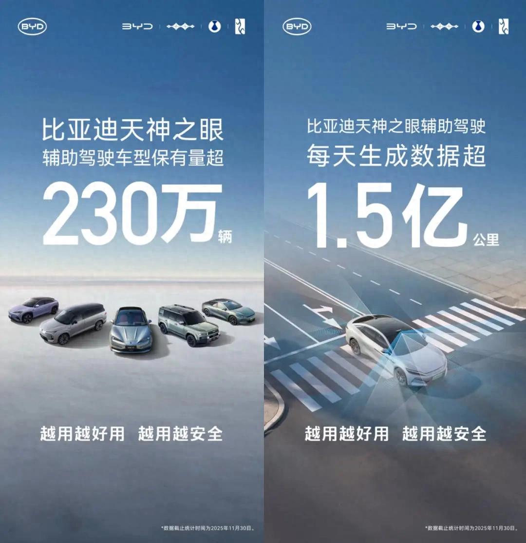 家人们,比亚迪又交出让人惊艳的答卷啦!11月,搭载“天神之眼”的车型销量突破31万辆,截至月底累计装车量超230万辆。这数据太震撼,辅助驾驶都从“科技玩具”变成“购车必选项”了。