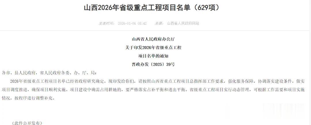 日前,山西省人民政府发布2026年省级重点工程项目名单,总共629项,其中钢铁项目12个,具体如下:
