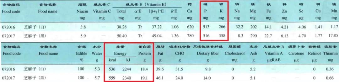下面是100g黑芝麻和白芝麻的成分含量,钾、磷、蛋白质含量都很高▼