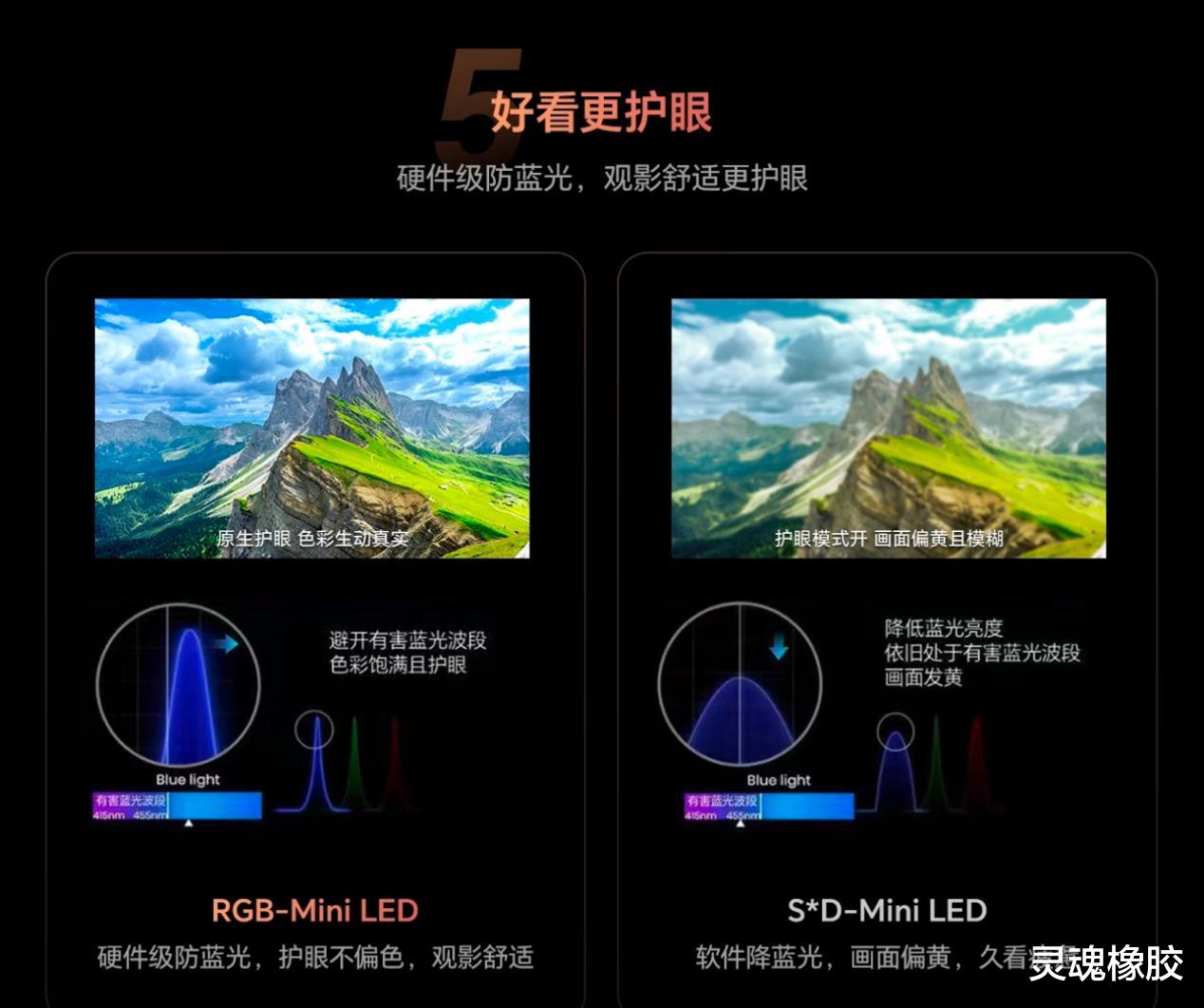 实际效果对比:你长时间看电视的话,RGB技术(的硬件级防蓝光能大大减少眼睛疲劳感,保护视力健康,特别适合有小孩的家庭。而SQD技术的软件降蓝光方式,长时间观看可能会导致眼睛干涩、疲劳等问题加剧。