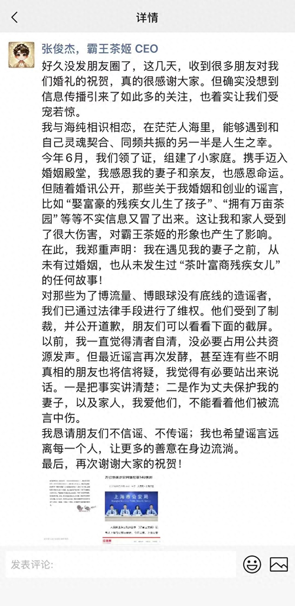 “我郑重声明:在我遇见我妻子(高海纯)前,从未有过婚姻,也从未发生‘茶叶富商残疾女儿’的任何故事。”这位90后创业者在他的朋友圈表示。