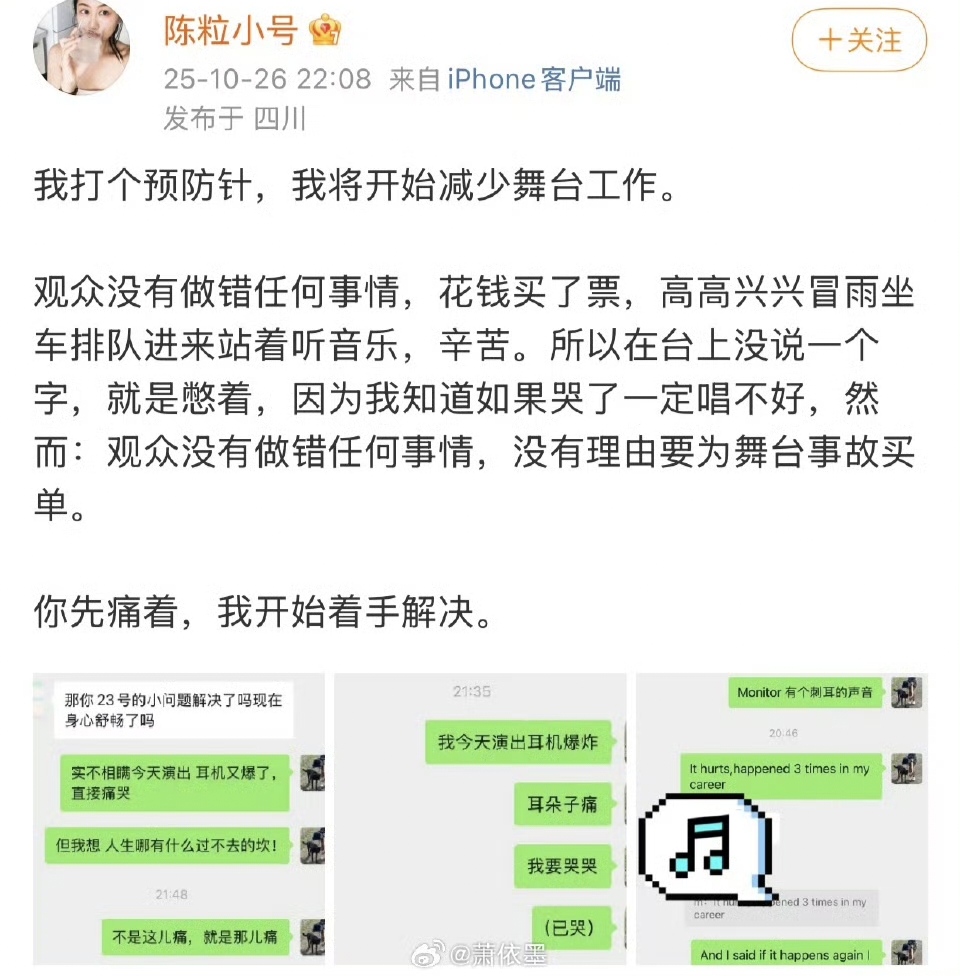 娱乐圈的瓜天天有,今天这个格外“响”。昨晚,民谣女神陈粒在Livehouse唱得正嗨时,突然表情管理失控——不是忘词,不是跑调,而是她的耳机当场“炸”了!没错,就是字面意思的“爆炸”,直接让现场观众和网友集体瞳孔地震。