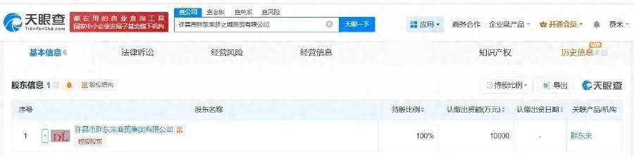 股东信息显示,该公司由许昌市胖东来商贸集团有限公司全资持股。