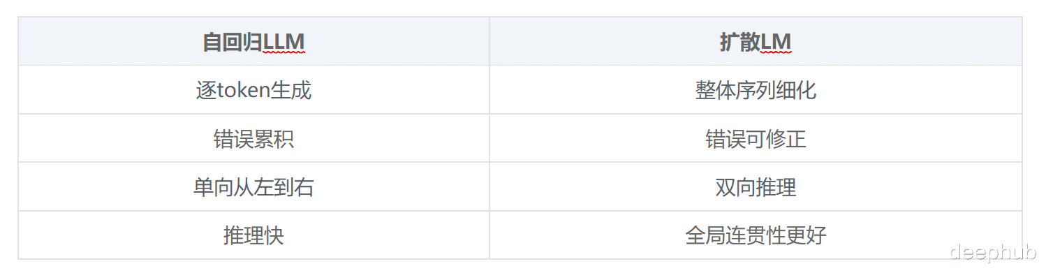 传统自回归是顺序生成,扩散模型的玩法不一样:先从噪声或者masked tokens开始,然后一步步把整个序列细化出来。它不是一个token一个token往后走,而是对整个输出做全局优化。