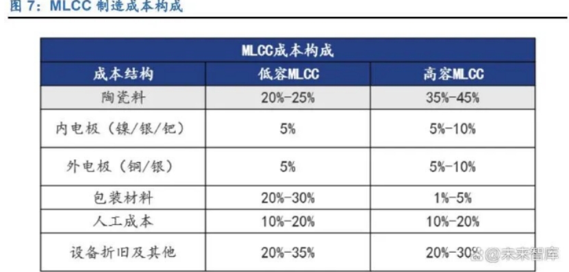 MLCC 的上游原材料主要包括陶瓷粉末和电极材料。陶瓷粉末是决定 MLCC 性 能的关键原材料,在 MLCC 成本结构中,陶瓷粉料占比最高,在低容 MLCC 中占比 20%-25%,高容 MLCC 占比 35%-45%。
