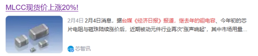 根据台媒《经济日报》2月初的报道,继去年的钽电容、今年初的芯片电阻与磁珠陆续涨价后,市场用量最大的MLCC也开始陆续调升报价,已有中国大陆渠道商陆续上调MLCC现货价,涨幅上看20%。