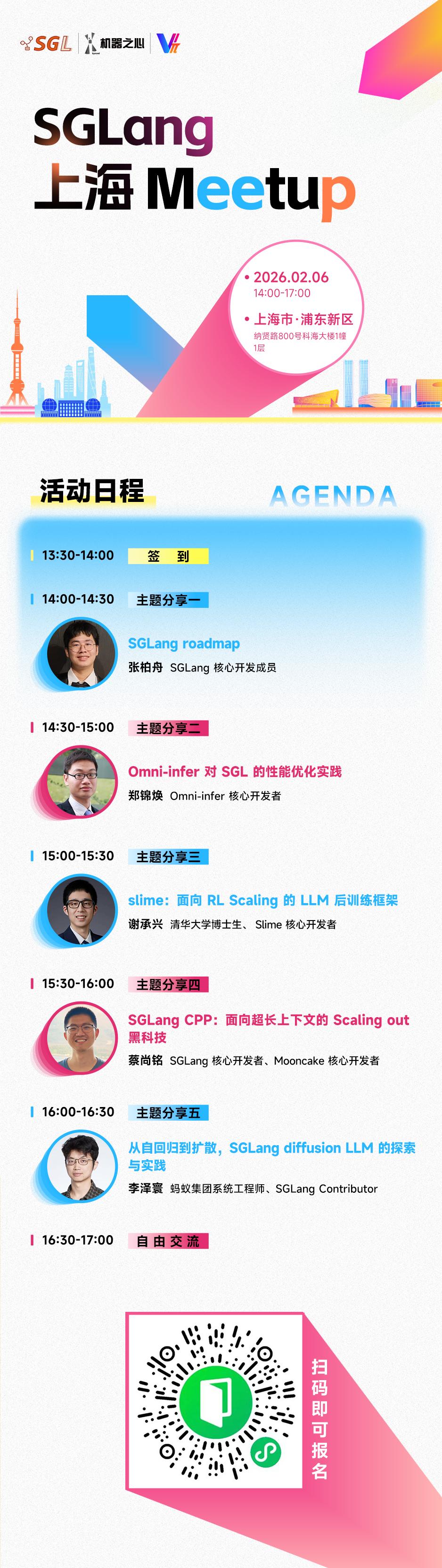本次 Meetup 将围绕 SGLang 技术路线、超长上下文扩展、RL 后训练框架、扩散语言模型探索等议题展开深度解析,并设有自由交流环节。诚邀开发者与研究同仁共赴现场,探讨 LLM 系统优化与落地实践的新可能。