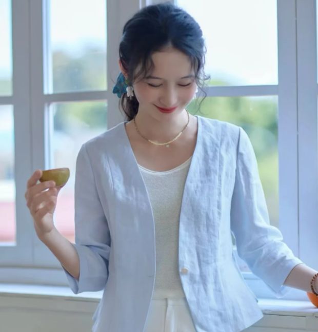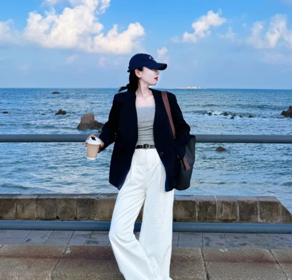 实际搭配时,无领西装的兼容度比想象中更高。内搭不必局限于衬衫,一件质感好的圆领针织衫或简约的丝质吊带,都能与无领口形成干净的比例。下装可以搭配同色系的高腰直筒裤,延续纵向线条的利落感;也可以与西装面料的半裙组合,适应办公室与下班后不同场景的切换。鞋履选择上,从皮质乐福鞋到简洁的平底穆勒鞋,都能与之自然融合,不会破坏整体的松弛感。