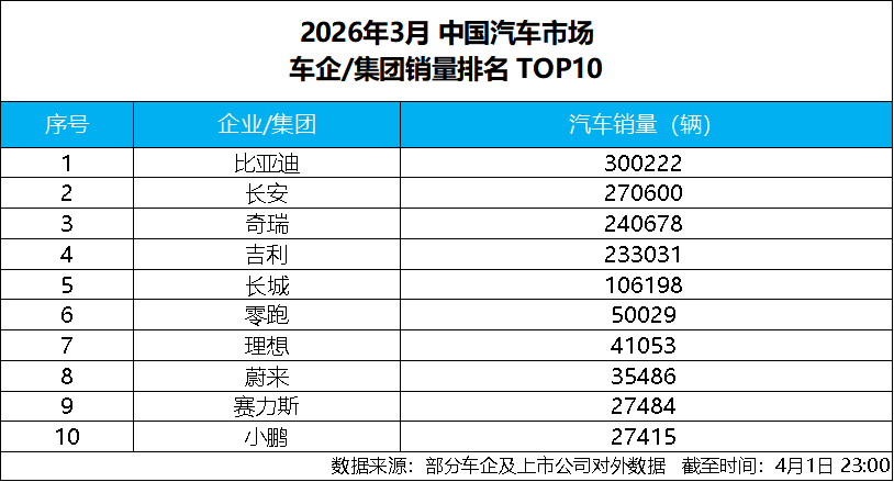 4 月 1 日,比亚迪发布 2026 年 3 月产销数据,单月总销量达300222 辆,强势突破 30 万辆大关,斩获中国车企销量冠军,并连续 58 个月蝉联中国新能源汽车销量冠军,持续稳固行业龙头地位。截至目前,比亚迪新能源汽车累计销量已超1580 万辆,一季度累计销售 700463 辆,以硬核数据印证技术与规模双重实力,助力一季度完美收官。