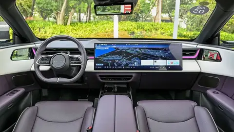 内饰方面,打开车门,马自达EZ-60采用简约设计风格,中控台配备了26.45英寸大屏,还搭载了流媒体后视镜、100英寸AR-HUD以及后排控制屏。新车采用了双辐平底方向盘以及怀挡式换挡机构。EZ-60的26.45英寸5K一体式大屏映入眼帘,科技感满满!这块屏幕画幅比例32:9,全面适配视频资源播放要求。5K屏幕分辨率同级很佳的,显示屏灰态亮度小于0.5nit。此外,大屏经过900小时零下40°到95°循环冲击测试,1000小时的常温稳定性测试,95°高温唤醒测试,好用且耐用。朋友说,这个大屏看电视剧或者孩子看动画片真是绝了。