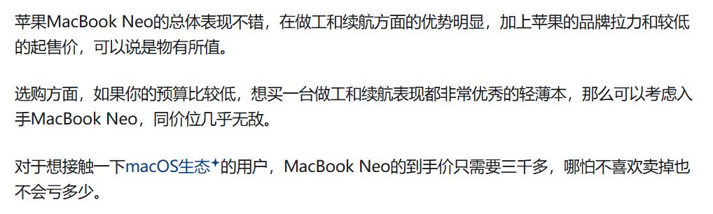 总结综合以上6点,我们不难发现MacBook Neo颇有点开倒车的嫌疑,虽然价格相比苹果其他笔记本是打下来了,但配置也跟着打下来了,低得已经很影响使用体验的感觉,手持同等预算,不如选择Window笔记本,完全足够入手一款真香机型。或者真喜欢苹果系统,还是咬咬牙买别的款式吧,MacBook Neo推荐不了一点。如果是工科类用途,就不推荐购买mac OS系统的笔记本了,很多软件的兼容性都不好,纯属给自己找难受,没必要。