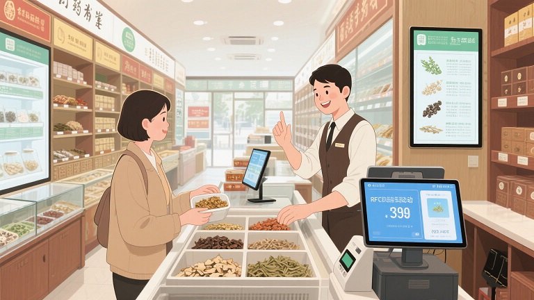 ◦ 某新型智能化中药材店利用 RFID 技术对销售流程进行了优化。在货架上安装了 RFID 读写器,当顾客拿起感兴趣的中药材产品时,读写器会自动识别标签信息,并通过店内的电子显示屏或顾客的手机 APP,展示该药材的详细信息,包括功效、用法用量、产地特色、搭配建议等,为顾客提供专业的选购指导。在结账环节,顾客将所选商品放入带有 RFID 读写器的结算区域,系统瞬间识别所有商品信息,自动计算总价,顾客可选择多种支付方式完成支付,实现了快速无感支付,大大缩短了结账时间,提升了顾客购物体验,也提高了店铺的服务效率。