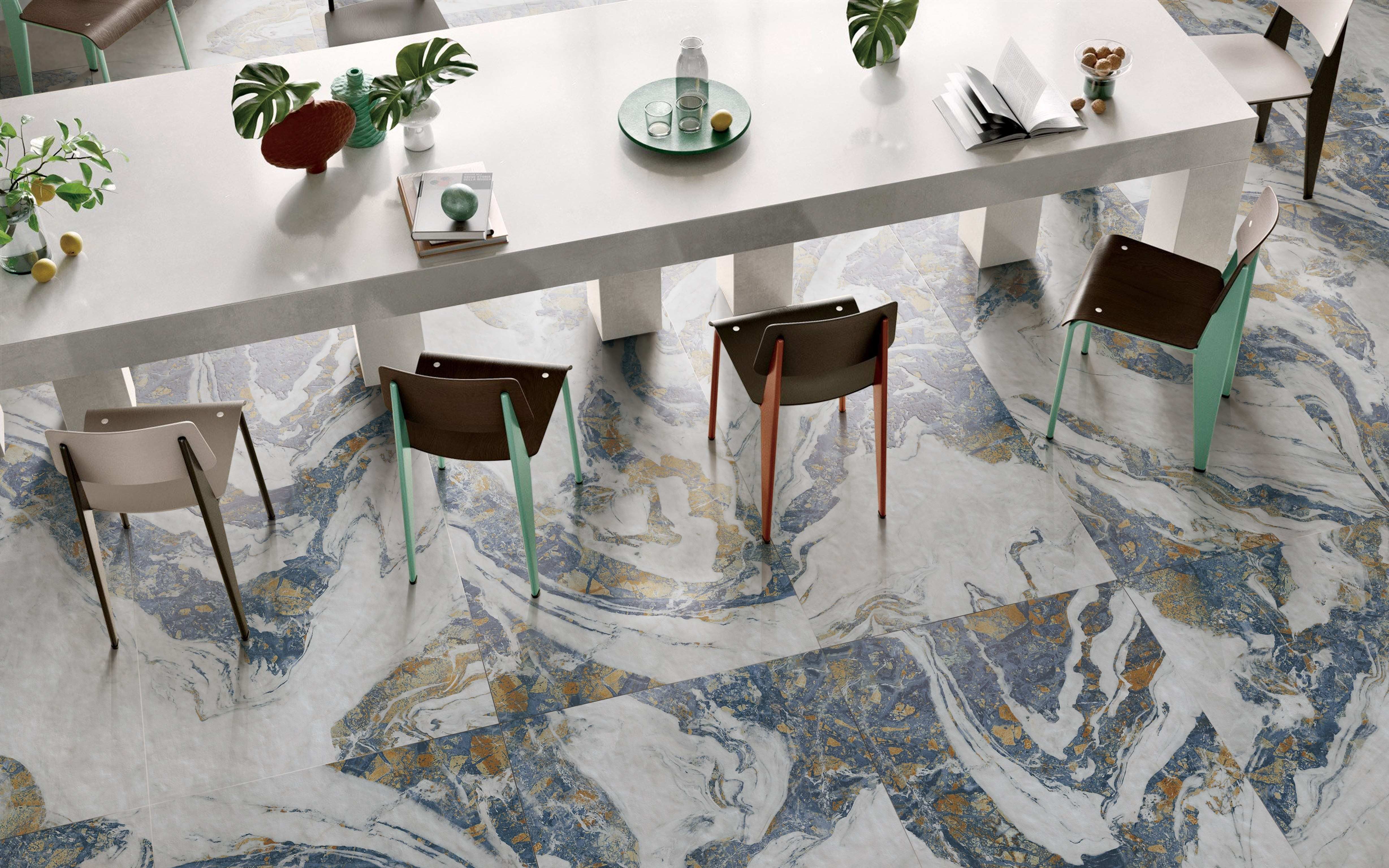 在开放式的社交空间里,地面铺满蓝金交织的国际瓷砖品牌伊丽莎白微哑奢石瓷砖,天然石纹如流动的艺术画卷,蓝的深邃、金的璀璨在微哑质感中被调和得恰到好处。搭配简约的白色长桌与色彩明快的座椅,冷冽的石材纹理与活泼的软装形成碰撞,瞬间打造出极具格调的互动场域。