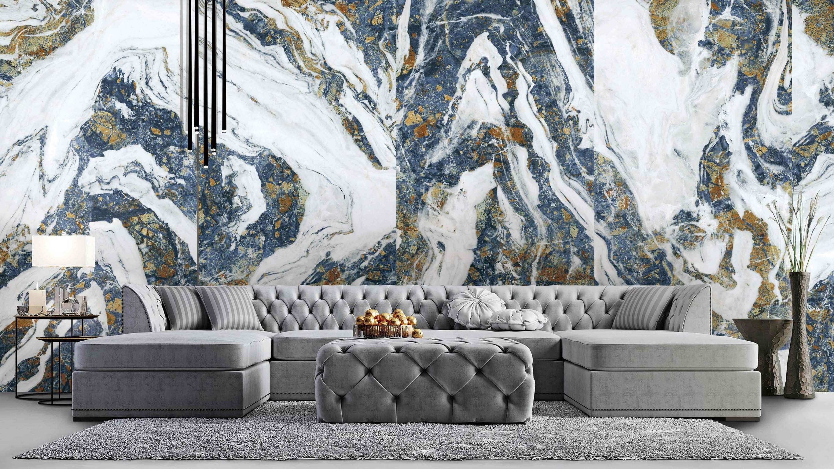 客厅的设计更是惊艳,整面墙采用同款国际瓷砖品牌伊丽莎白微哑奢石瓷砖,蓝金纹理如山峦叠嶂,在微哑质感下,光泽柔和却极具视觉冲击力,仿佛把自然的磅礴与艺术的精致都定格在了墙面。搭配浅灰色的绒面沙发与金属质感的灯具,复古与现代的风格交织,让客厅秒变艺术展厅。