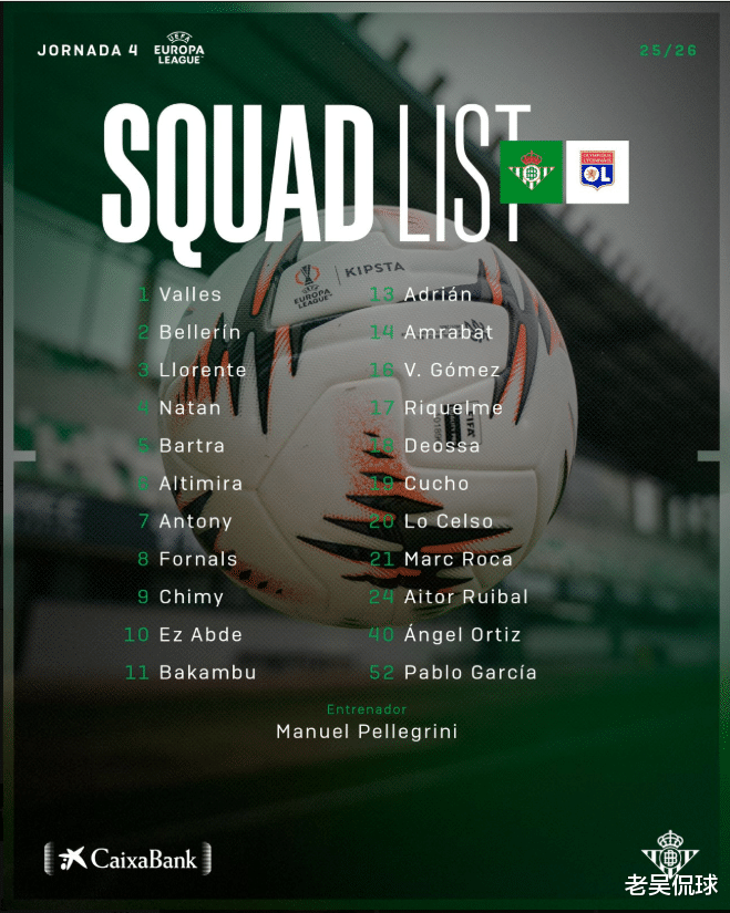 贝蒂斯已公布了本场大名单,伊斯科、菲尔波、保·洛佩斯三名伤兵继续缺席,后卫里卡多·罗德里格斯也在赛前因伤退出,其余主力都在列。和以往一样,贝蒂斯继续会进行轮换,周末西甲是客场对巴伦西亚,压力不算大,有可能今晚会派出更多主力首发。