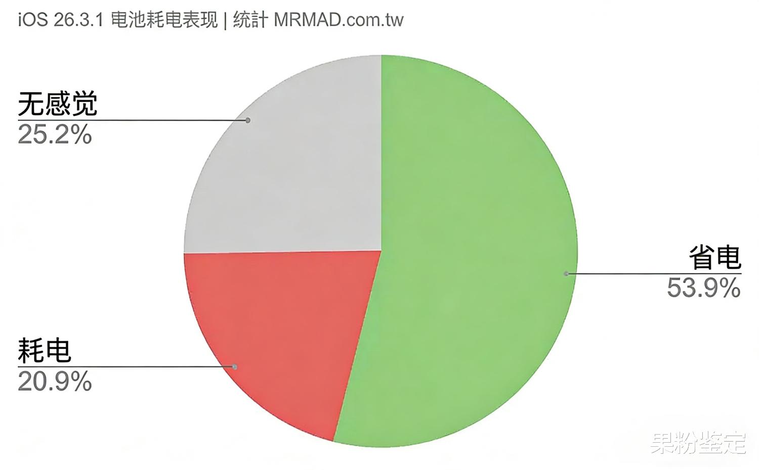 从众多网友回报iOS 26.3.1续航表现统计数据来看,这次在整体iPhone省电反应达到近54%,相较比起以往都能感觉更省电,对于少数会发现耗电同样仅有20%左右,也算是少数感觉耗电,大多对于新版电池省电有感。