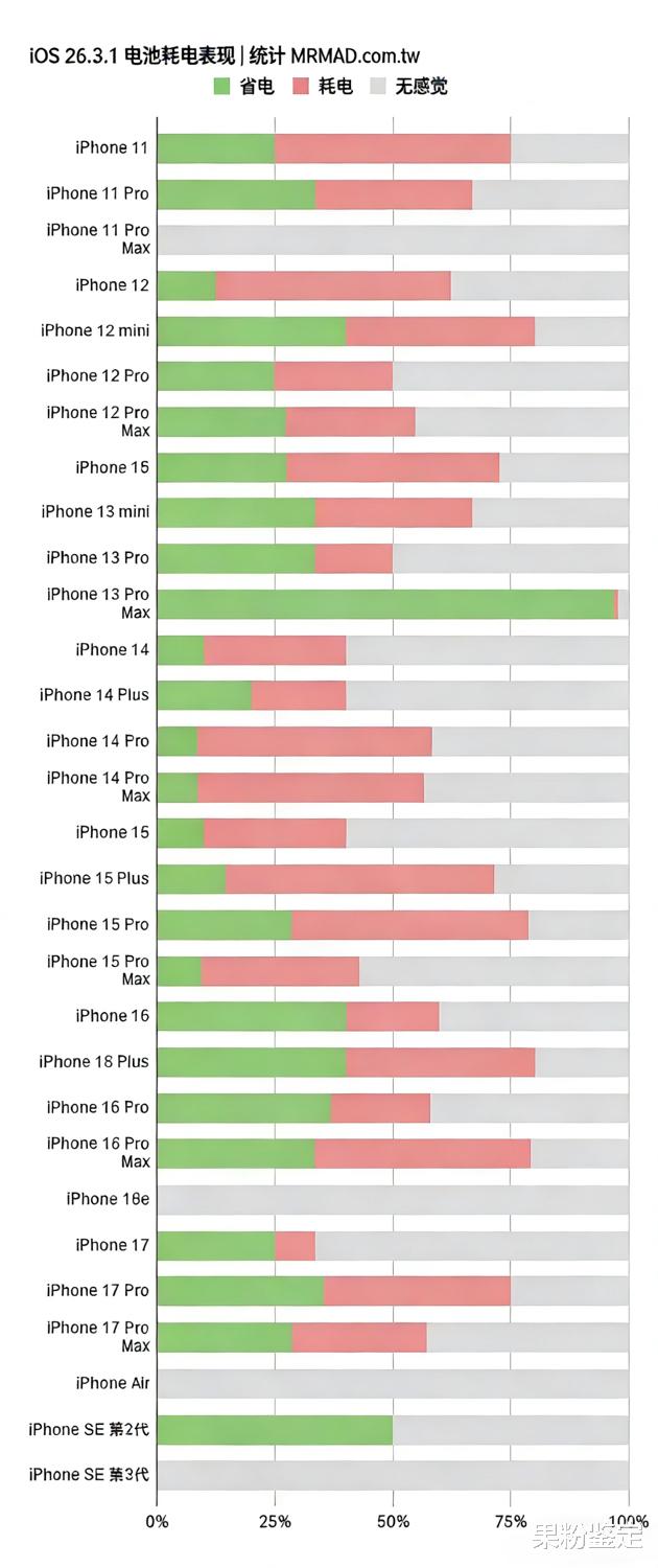 各款iPhone机型在iOS 26.3.1续航统计数据就算国外测试并没有完整跑所有 iPhone 机型,也可以通过以下由网友回报的 26.3.1体验统计资料,同样可以看出每款 iPhone 升级后的实际体验,相信数据会比起单纯询问某位网友会更准确: