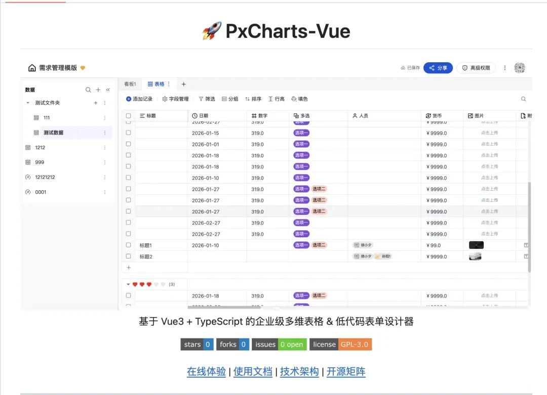 如果你也在寻找一款开箱即用的多维表格解决方案,如果你相信数据协作还有更好的可能,欢迎来 GitHub 搜索 pxcharts-vue,或者访问我们的演示网站。你可以免费使用,可以贡献代码,也可以在留言区交流反馈。