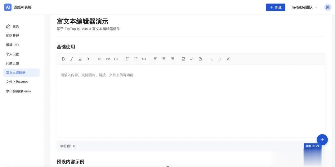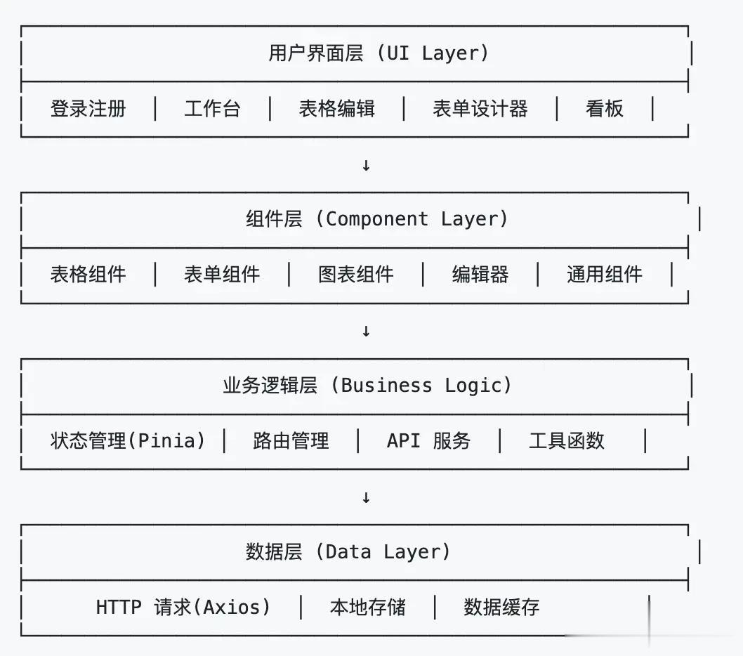 多维表格 - 灵活的数据视图切换(表格视图、看板视图、日历视图) 低代码表单设计器 - 拖拽式表单构建,支持丰富的表单组件和自定义配置 数据可视化 - 集成 ECharts 图表库,支持多种图表类型和自定义配置 富文本编辑器 - 基于 Tiptap 的强大编辑能力,支持图片、链接、文本样式等 模板市场 - 内置丰富的行业模板,快速启动项目 团队协作 - 支持多团队管理、成员邀请、权限控制 水印编辑器 - 自定义水印样式,保护数据安全 文件上传 - 完善的文件管理功能 响应式设计 - 适配各种屏幕尺寸,提供优质的移动端体验下面我会和大家分享一下我们这个项目使用到的技术方案和功能亮点,供大家参考研究。