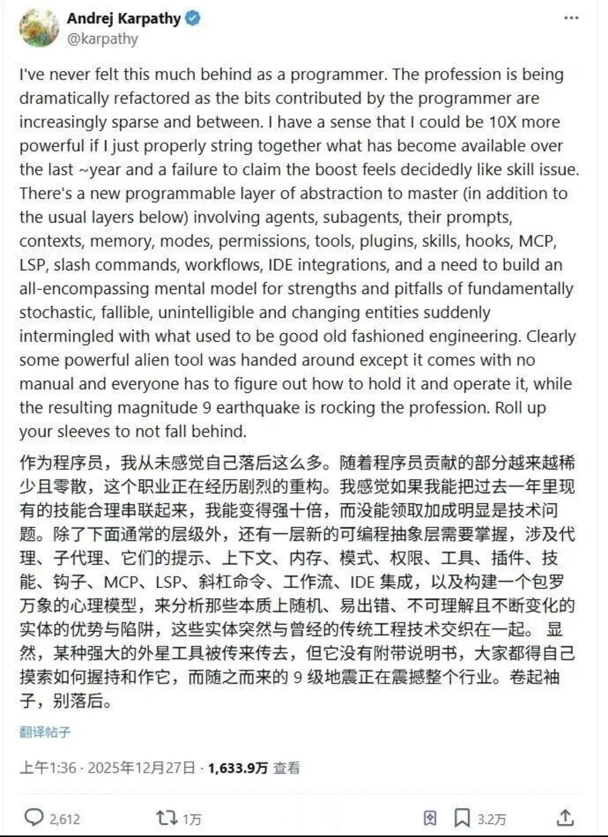 在代码领域,2022年的时候,AI还只能进行代码补全,而在2025年,就像特斯拉前总监,OpenAI创始成员,世界的顶尖程序员卡帕西都觉得自己落后了。