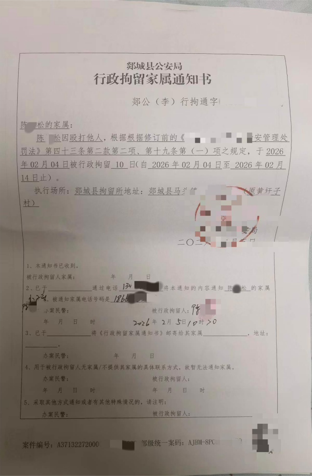 更让陈某松一方难以接受的是,在此次调解过程中,郭某辰家长提出要求,让陈某松分别向郭某辰、郭某岩各赔偿 8000 元,两项合计 16000 元,陈某松明确拒绝该赔偿要求,办案单位遂对其作出行政拘留十日、罚款 800 元的行政处罚决定。1月14日,相关执法人员曾将陈某松带至看守所做拘前体检,可后续问询中却未承认该体检为拘前体检;而2月4日陈某松实际被拘留时,执法人员并未再为其安排体检。陈某松对此提出质疑,认为相关说法存在明显的前后矛盾。