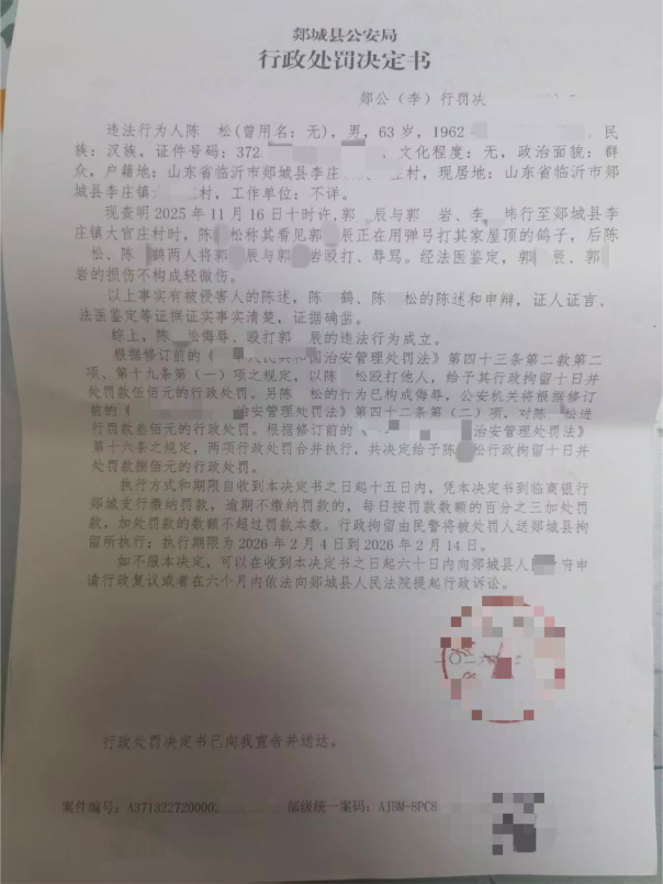 2025 年 11 月,山东省临沂市郯城县李庄镇大官庄村村民陈某松为制止他人弹弓击打自家鸽子引发冲突,其本为维护自身合法财产权益,却被办案单位作出拘留、罚款的行政处罚,涉事的郭某辰等人未受到实质性处罚,还向陈某松一方提起近万元民事索赔。陈某松父子历经两个多月多渠道维护权益,该事件于 2026 年 1 月正式立案,然而截至目前,案件仍无实质性处理进展。警方在该事件的现场处置、证据采纳、调解程序等环节的相关操作,遭到当事人的强烈质疑,这起普通民间冲突也因处理过程中的诸多问题,引发公众对办案公正性的关注,一系列待解问题亟待相关部门依规核查并作出明确回应。