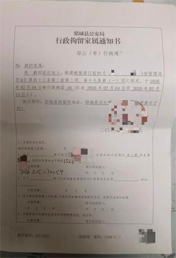 (行政拘留家长通知书,由陈先生提供)