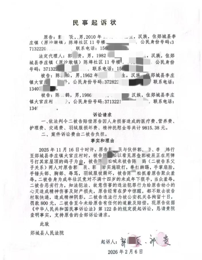 维护权益方遭民事索赔 相关行为被指存在不当嫌疑在陈某松父子被作出行政处罚后,郭某辰一方随即向法院提起民事诉讼,以陈某松对“未满 14 周岁未成年人实施行为”,存在聚众羞辱、撕坏衣物等行为为由,要求其赔偿医疗费、营养费、护理费、精神抚慰金等共计 9815.38 元,还称该行为造成郭某辰精神方面的影响,出现梦中惊醒、不敢前往该村取快递等情况。