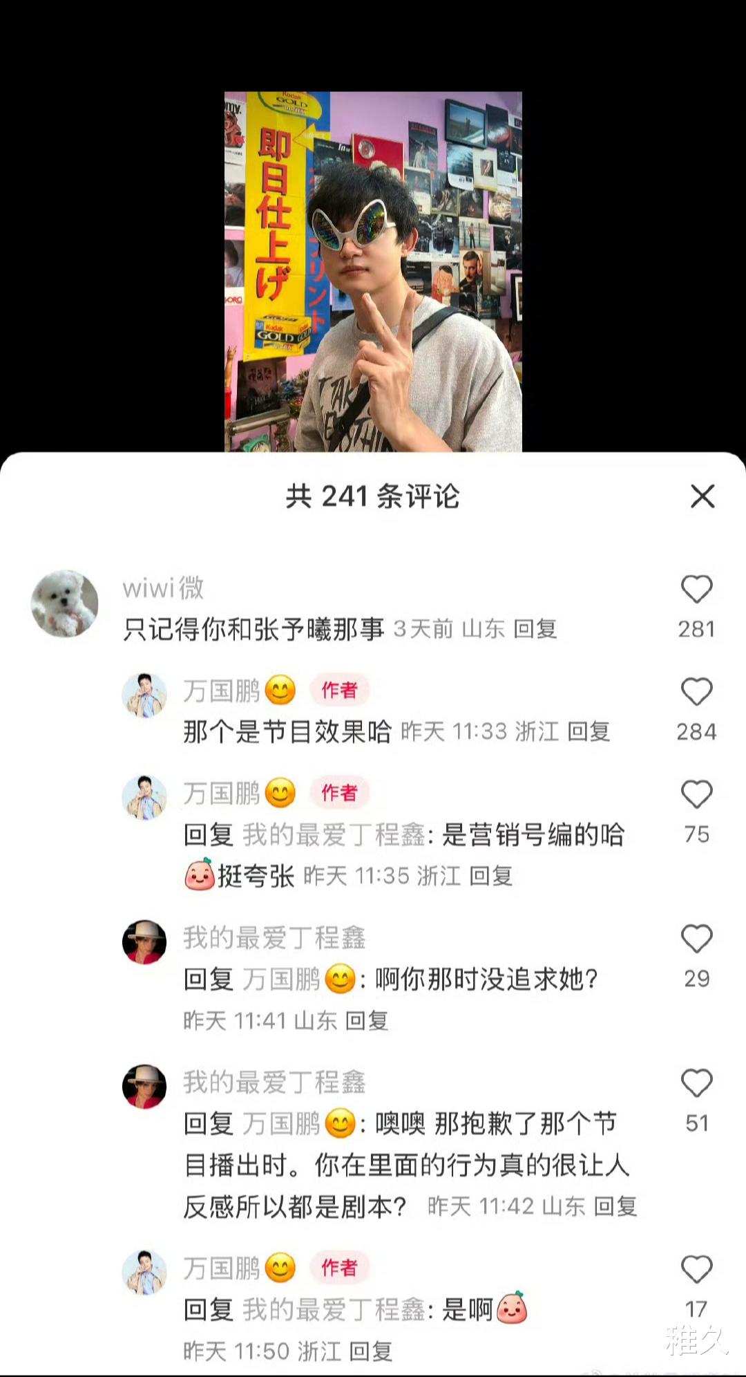 最终,张予曦因为无法忍受这种压力,选择了退出节目录制。而万国鹏的回应却称这一切都是节目效果,是剧本设计的。这一说法立刻引发了网友们的热议。部分网友认为,既然是在综艺节目中,那么很多行为都可能是为了节目效果而设计的,不必过分解读。他们认为万国鹏的回应是在澄清事实,避免观众对节目内容产生误解。