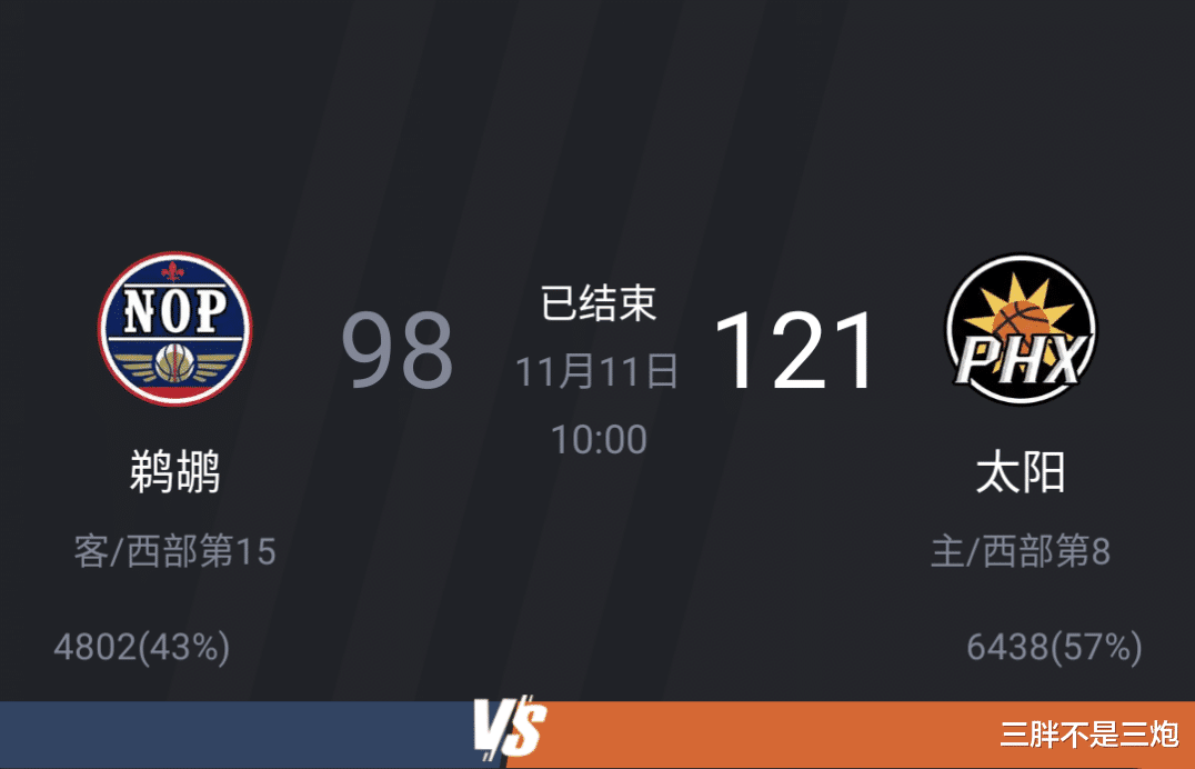 新奥尔良鹈鹕98:121 菲尼克斯太阳