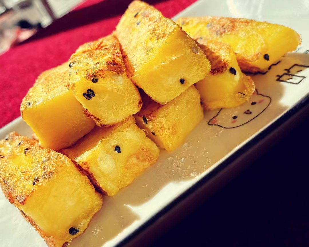 4把小奶块蘸上一层淀粉,再蘸上鸡蛋液,再用不粘锅把奶块煎到金黄色。入口软嫩,甜甜的,非常好吃。没有牙的小宝宝也能吃。