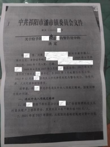 2025年12月18日,祁阳市潘市镇委员会下发文件,经调查认定,冯某存在违反八项规定精神、违反法律法规等问题,具体包括2021年至2025年期间,将收取的“基础设施建设费”未纳入社区集体账户管理,以“广告费”名义套取资金发放干部补助,违规列支“茶油采购费用”及“招待费”等。