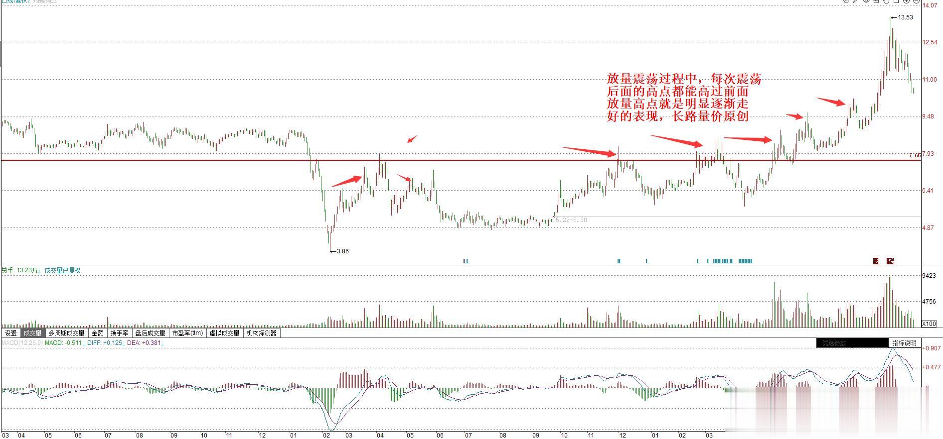 什么意思呢?就是当股价在出现这种放量震荡过程中,要走出来高点逐渐抬高的走势,那怕是这次的上涨,只是用上影线创出来一个新高,也比那种,只是上涨到前高放量震荡下面就开始下跌要强很多的。
