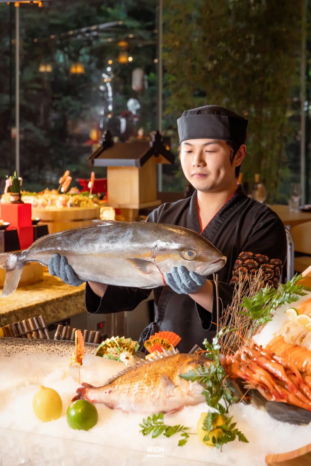 而刺身专区的金枪鱼更是仪式感十足,整条鱼被推至料理台,大厨精准下刀的瞬间,绯红肌理间的油花清晰可见。
