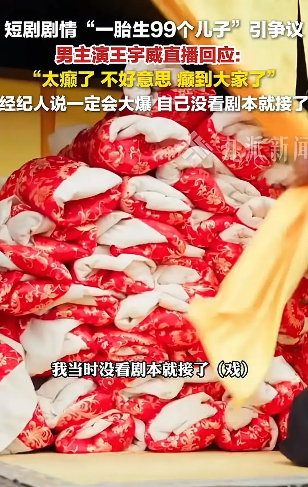 “一胎99子”网剧男主王宇威在直播时回应了此事,他表示:“当时经纪人接下这部戏,围读剧本的时候就已经发现了这个剧情,当时只是感觉很癫”。