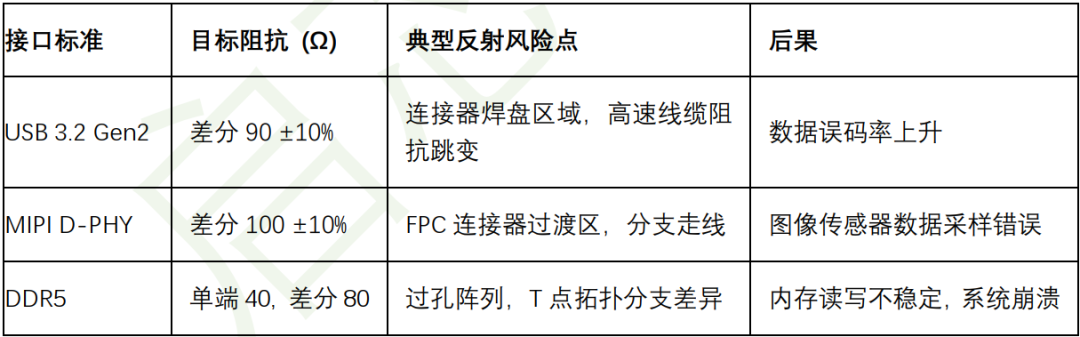 小知识:为什么50Ω如此普遍?在消费电子领域中常见50Ω单端阻抗(如HDMI, DDR时钟线)或90/100Ω差分阻抗(如USB, MIPI, PCIe)。这是源阻抗、传输线功率传输能力及损耗特性之间的最为合适的工程平衡点,已成为行业默认标准。偏离此标准将显著增加反射风险,是PCB layout设计需要重点关注的。
