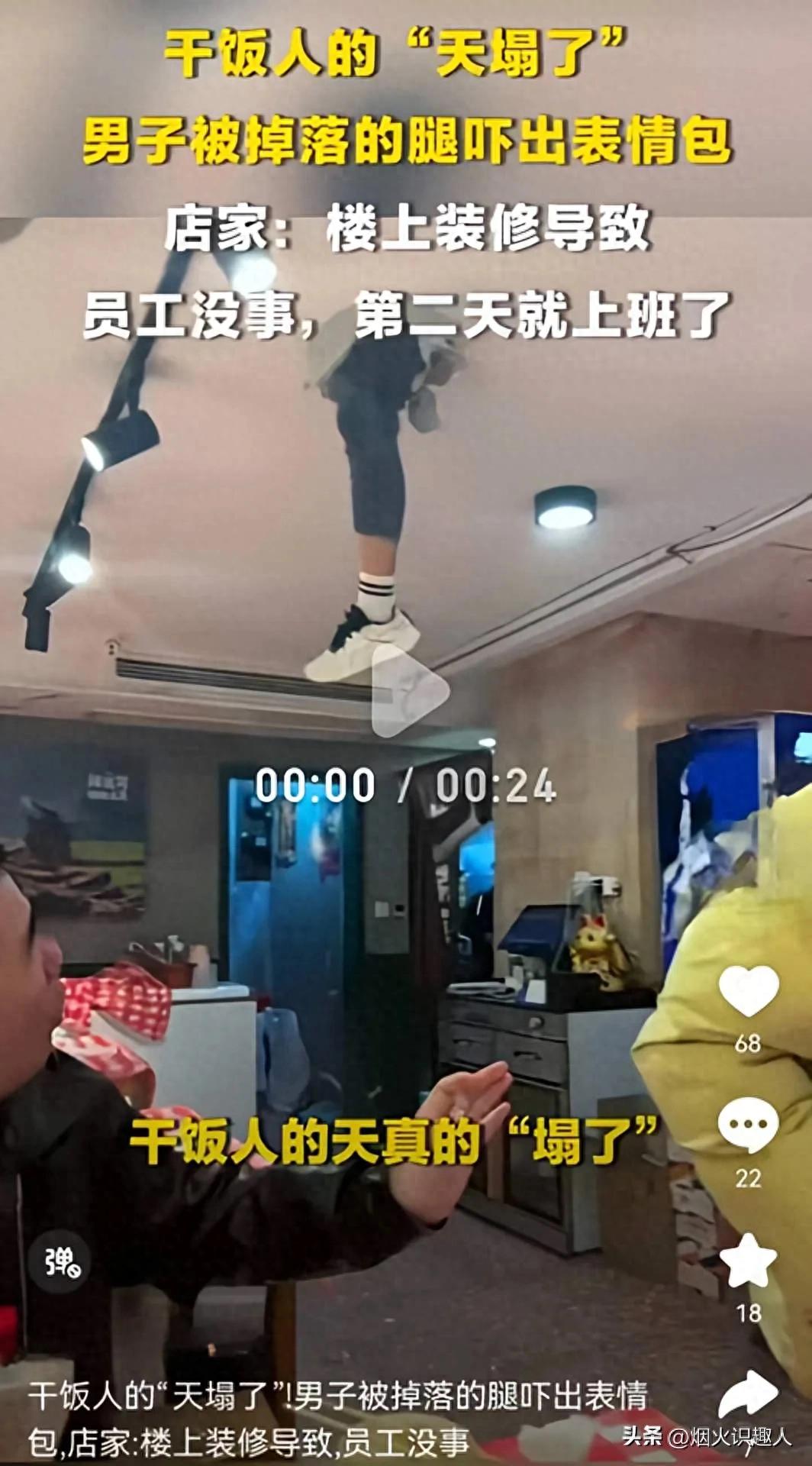 02 多方视角亲历顾客:好好吃饭,突然天花板破了,一条腿掉眼前,直接被吓出表情包,太惊悚了。