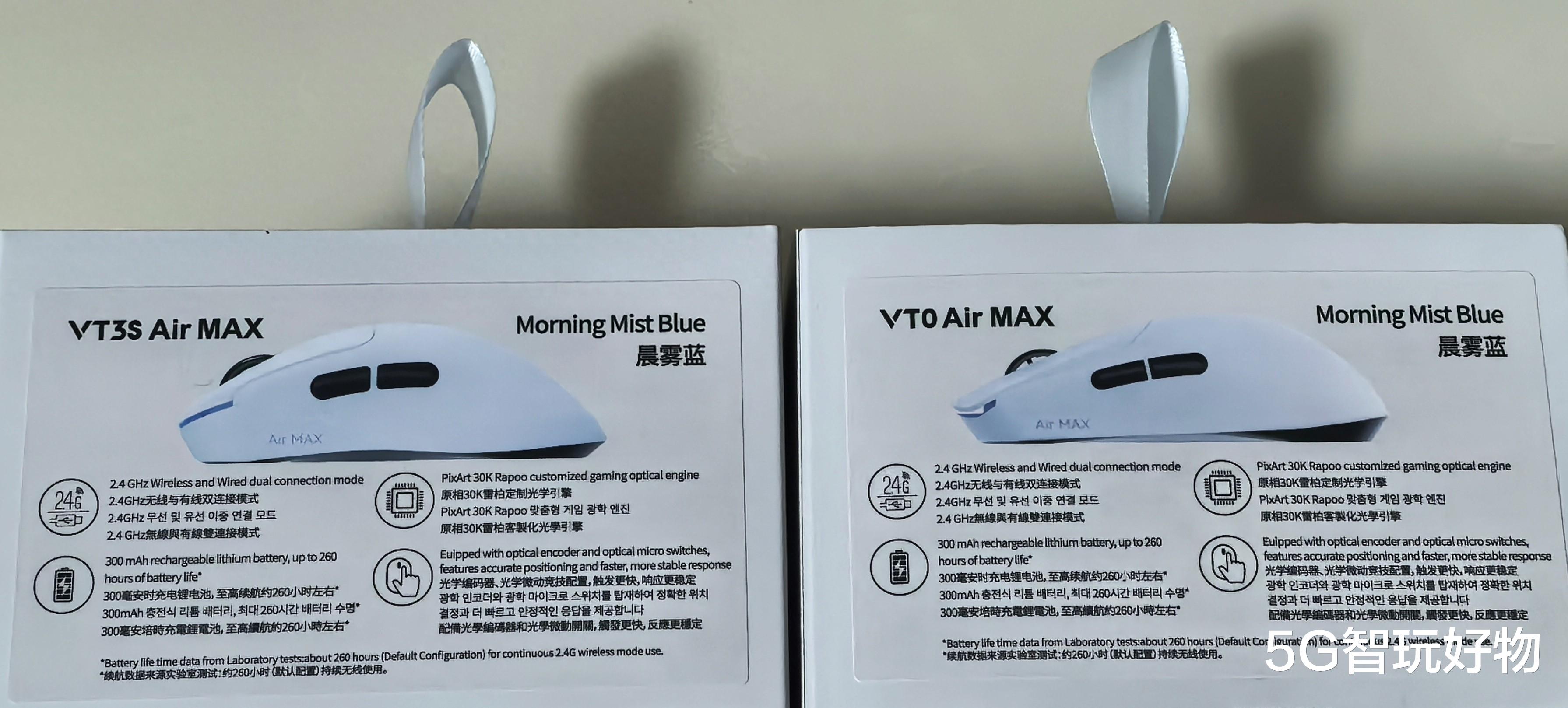 平时爱打电竞游戏、手又不算大的男女生来着了,最近5G智玩好物看上了雷柏两款Air Max二代双8K版游戏鼠标要推荐给大家——VT3s Air MAX和VT0 Air MAX,我体验了晨雾蓝这个配色,真的戳中我这个蓝色控了。我就实打实说说体验感受,不吹不黑,给中小手的朋友一个参考。