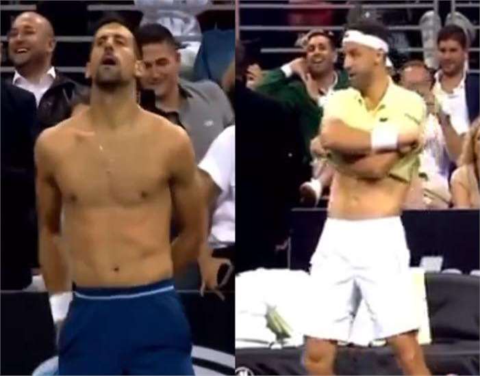 比赛过程中,德约科维奇和迪米特洛夫充分展现了他们的幽默感和表演天赋。他们时而做出夸张的表情和动作,时而互相调侃打趣,让整个球场充满了欢声笑语。最令人难忘的是,他们竟然在比赛中表演了一场轻松愉快的“脱衣舞”。这一幕让现场观众们捧腹大笑,也为这场表演赛增添了不少趣味性和观赏性。