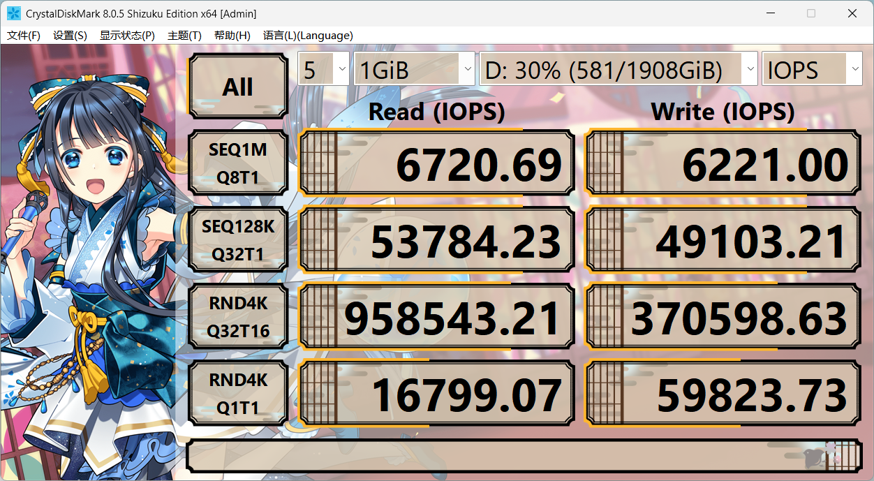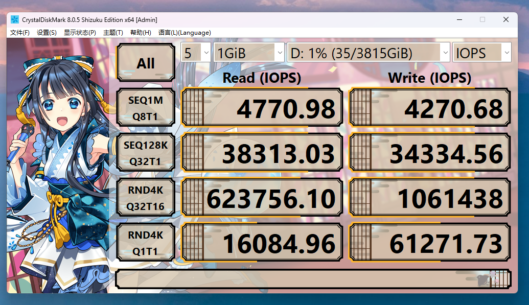 🔺然后换做CrystalDiskMark的IOPS测试(硬盘每秒能够处理多少次读写操作指标,关系到系统的响应时间和数据处理能力),通过检测我们可以看到它在4KB随机读取上可达到623K IOPS,写入上更是高达1061K IOPS,这个数据可以说是相当亮眼了,基本属于同价位的最高水平!