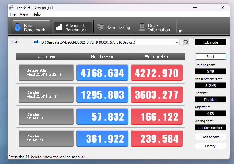 🔺在老牌的硬盘性能测试工具TxBench检测中,可以看到它的读取速度 4768 MB/s,写入速度4272 MB/s,和前面的CrystalDiskMark测试的结果差距不大,这个也间接说明它的性能输出比较稳定,至少在不同的测试条件下,结果不会有很大的波动。