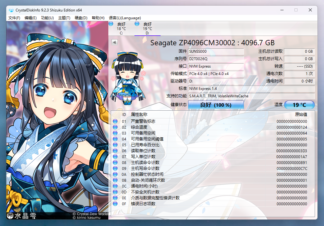 🔺先通过CrystalDiskInfo对硬盘进行一个综合检测,可以看到这款硬盘依然显示出了 4096.7GB 的存储容量。它采用的是标准NVMe 1.4,具有PCIe 4.0x4通道传输模式,蒋康状态100%,通电次数1,通电时间0,基本可以判定为全新硬盘了!